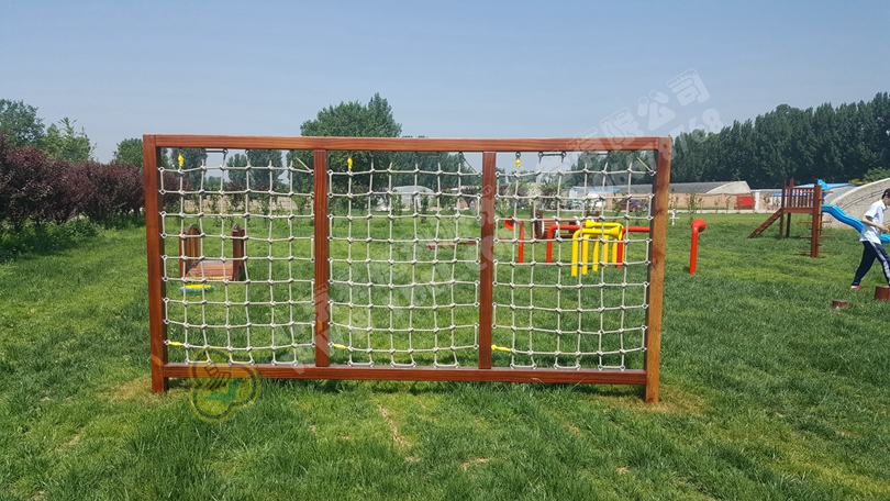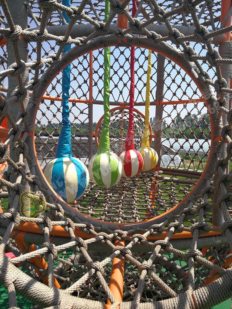 拓展繩網架,整體凹凸形態,全手工編織,采用中心嵌鋼絲專業航海繩,適用于戶外常年使用。孩子徒手順繩網攀爬上行,沿螺旋筒滑順勢下行。彩色蕩球懸掛架體,增強爬網的趣味性,實現一物多用,充分有效利用空間。
