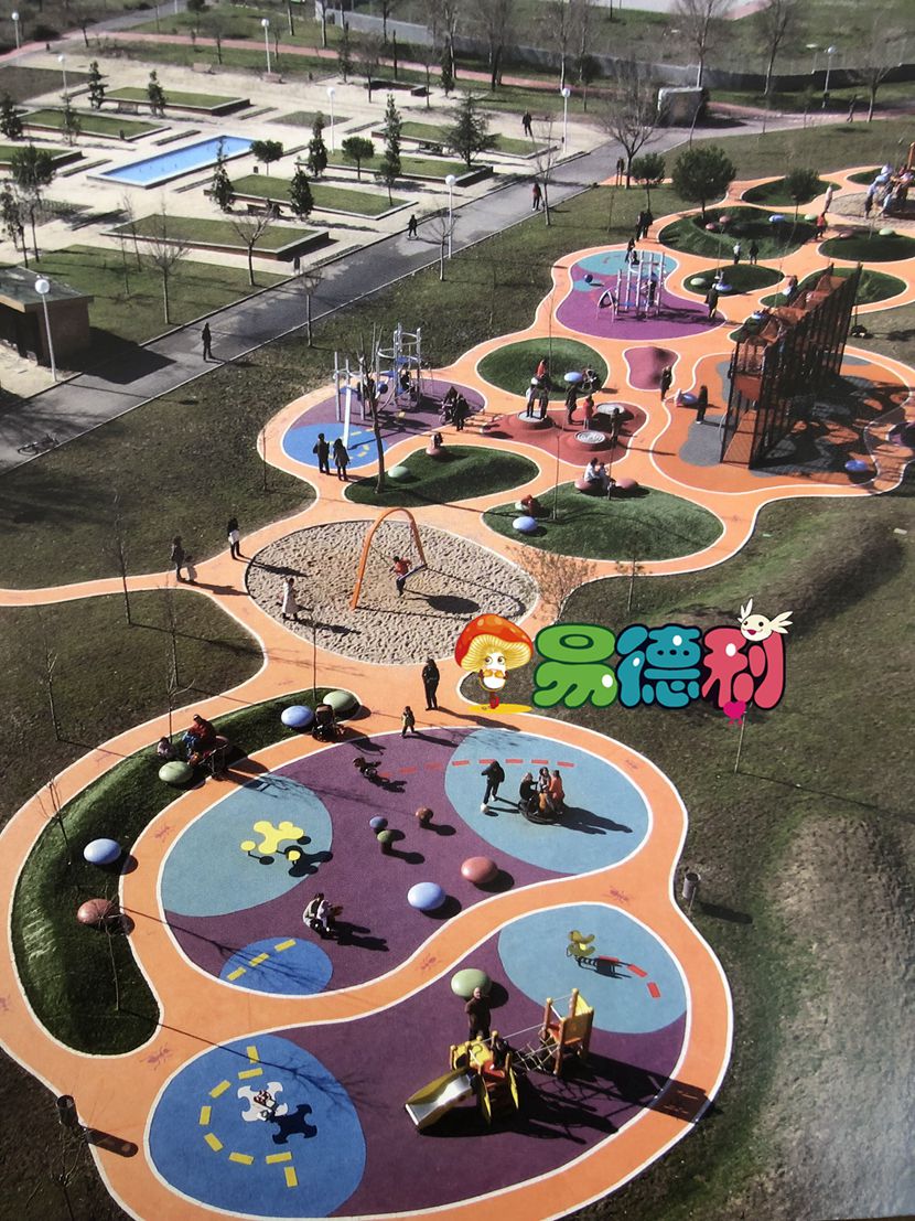 采用不同顏色以及不同色彩的材質鋪設游樂場,以區分不同區域。例如,不同顏色的地膠,人工草皮和石英砂。