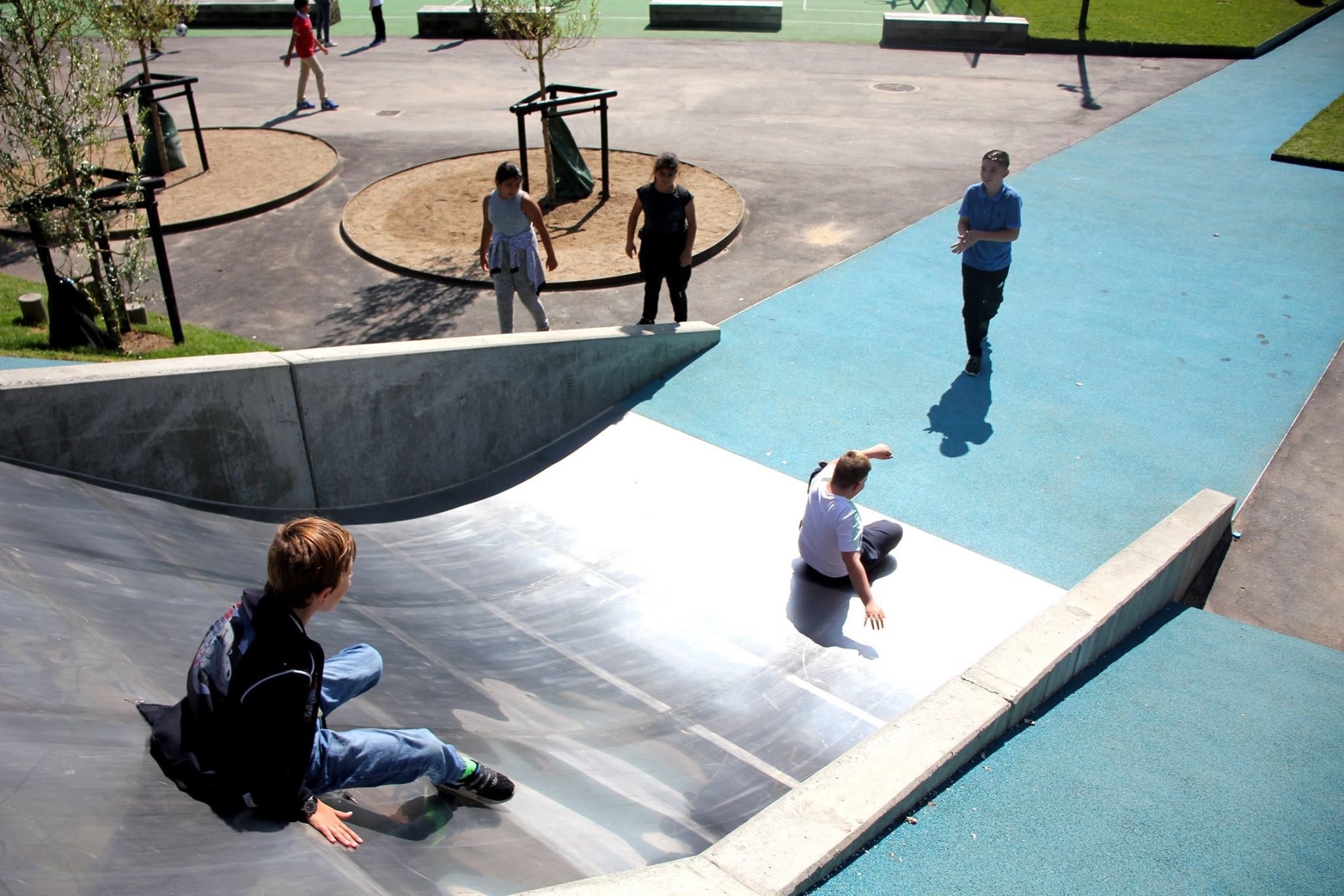 Skolegården er tænkt som et epicenter for ophold og aktivitet, hvor gårdens farvede flader skærer sig på tværs af parkstrøget, hvori forskellige opholds- og aktivitetsrum opstår. Udenfor skolegården, på kanten af parkstrøget, er der opsat et stort udendørs klatremiljø, heriblandt et 15 meter højt klatretårn.