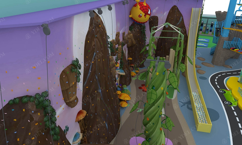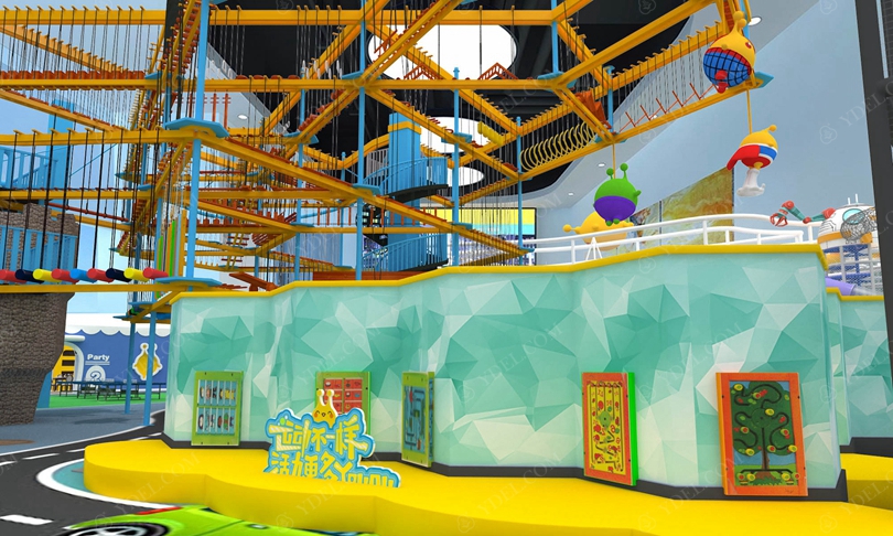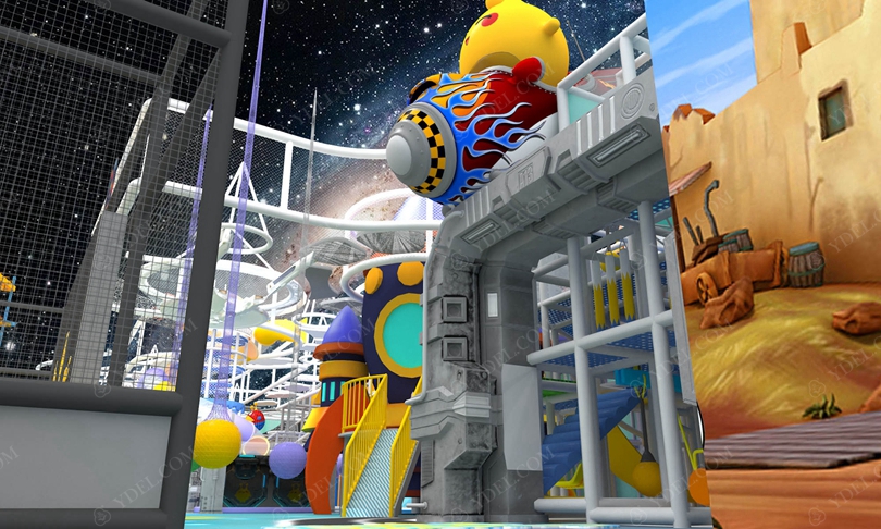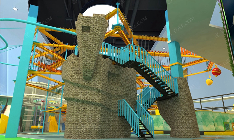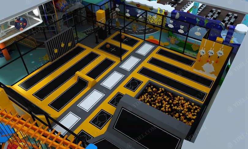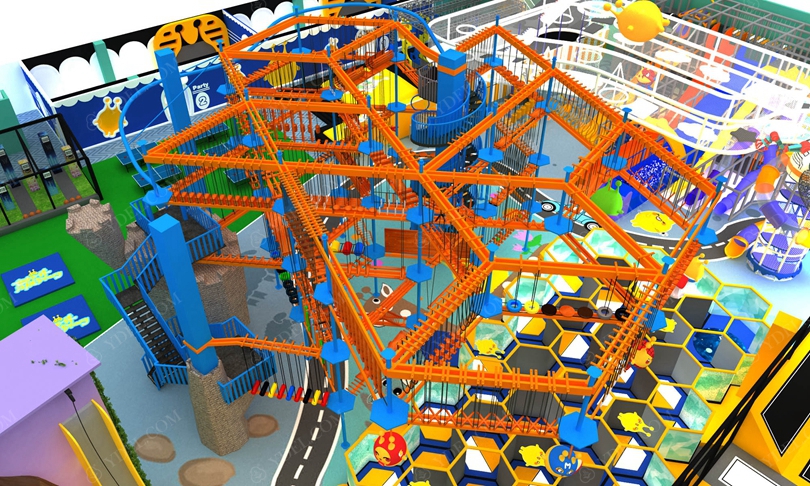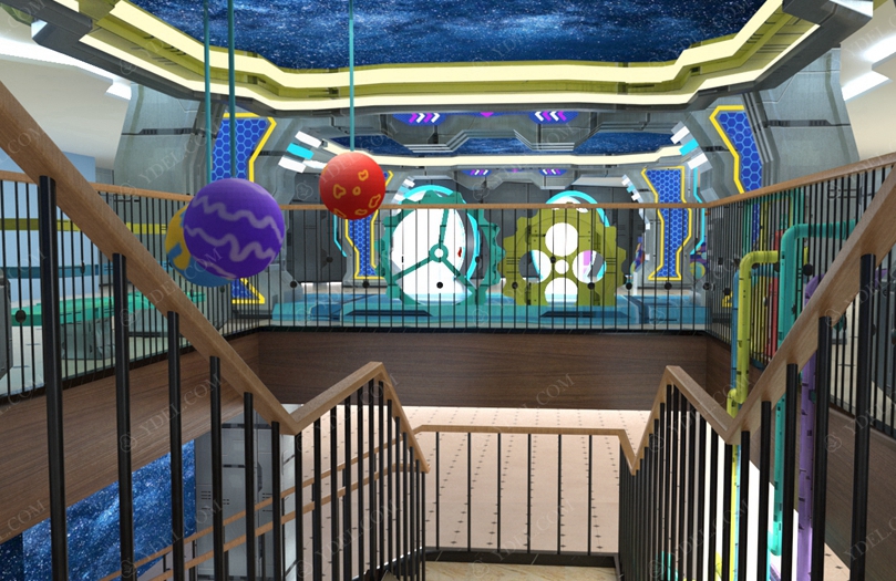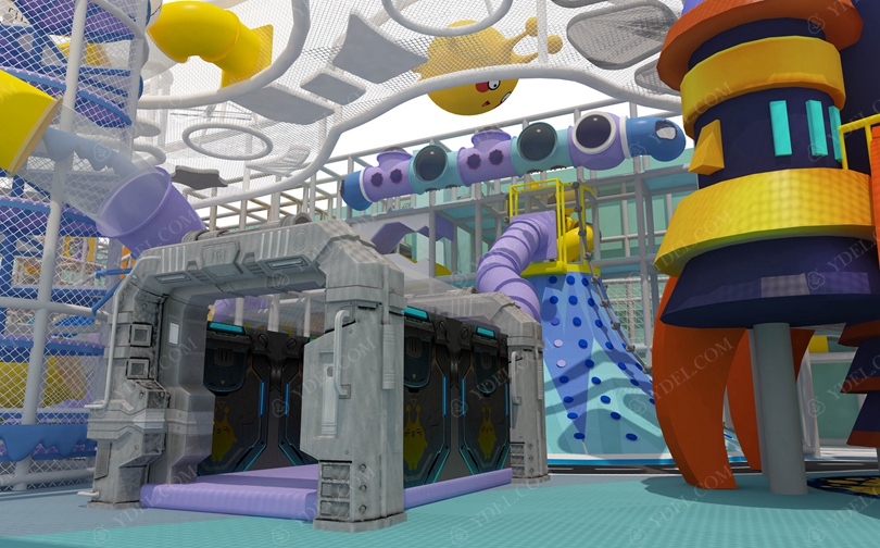 TQB-845室內兒童淘氣堡樂園采用立體式設計,通過不同的分層確保游戲區的分割性,采用機械風格和卡通風格相結合的設計理念,配色上采用對比設計,輔助一些兒童喜歡的元素設計,使得淘氣堡對小孩子更具有吸引力。