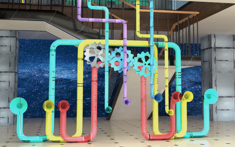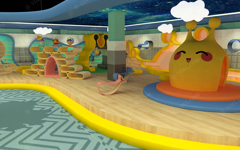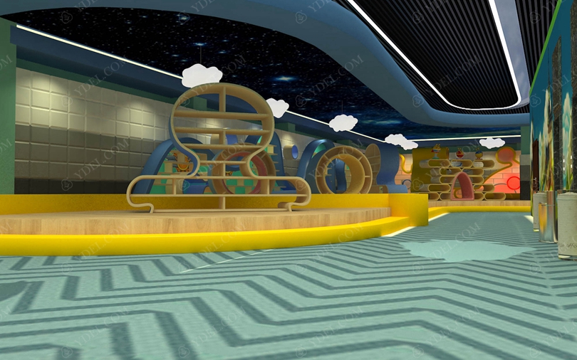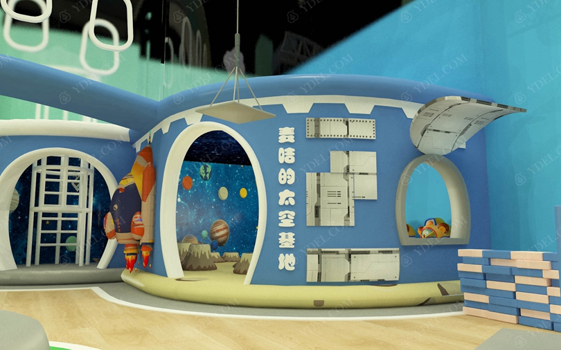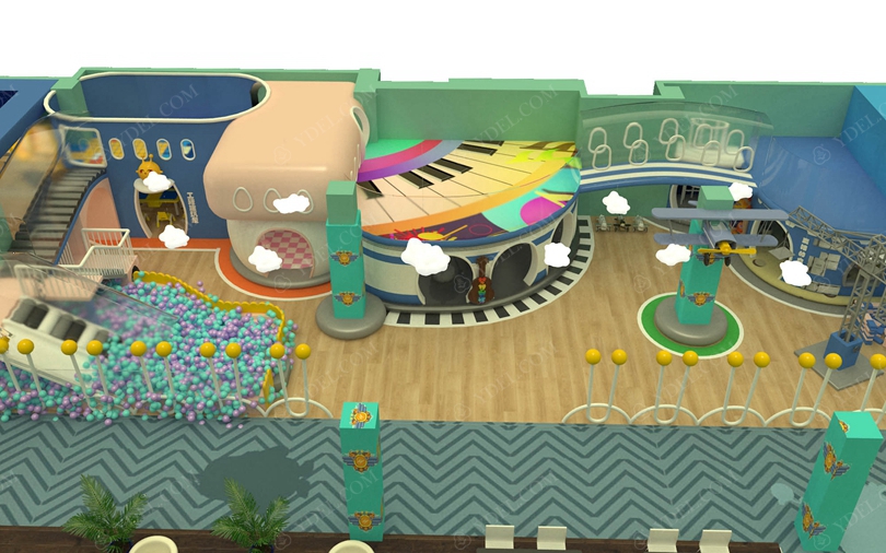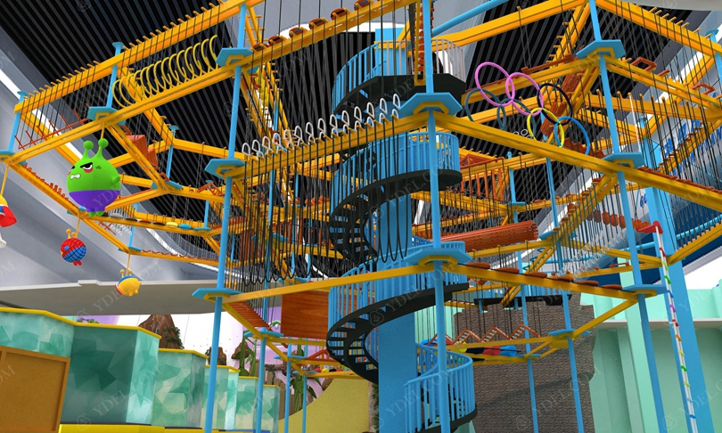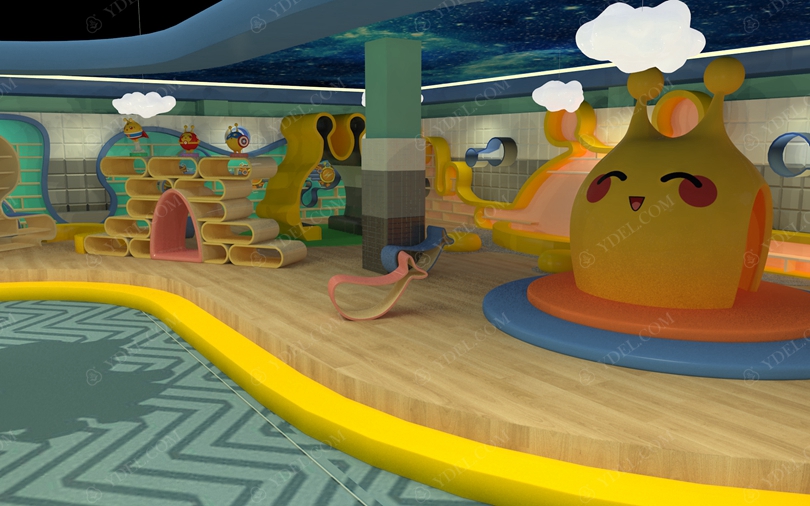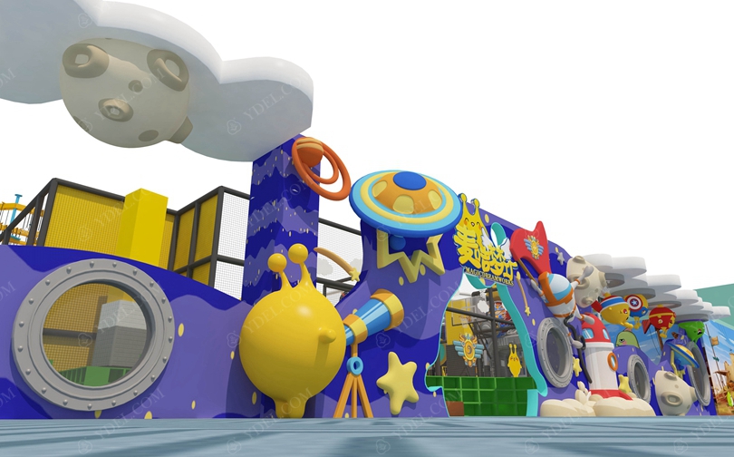 TQB-845室內兒童淘氣堡樂園采用立體式設計,通過不同的分層確保游戲區的分割性,采用機械風格和卡通風格相結合的設計理念,配色上采用對比設計,輔助一些兒童喜歡的元素設計,使得淘氣堡對小孩子更具有吸引力。